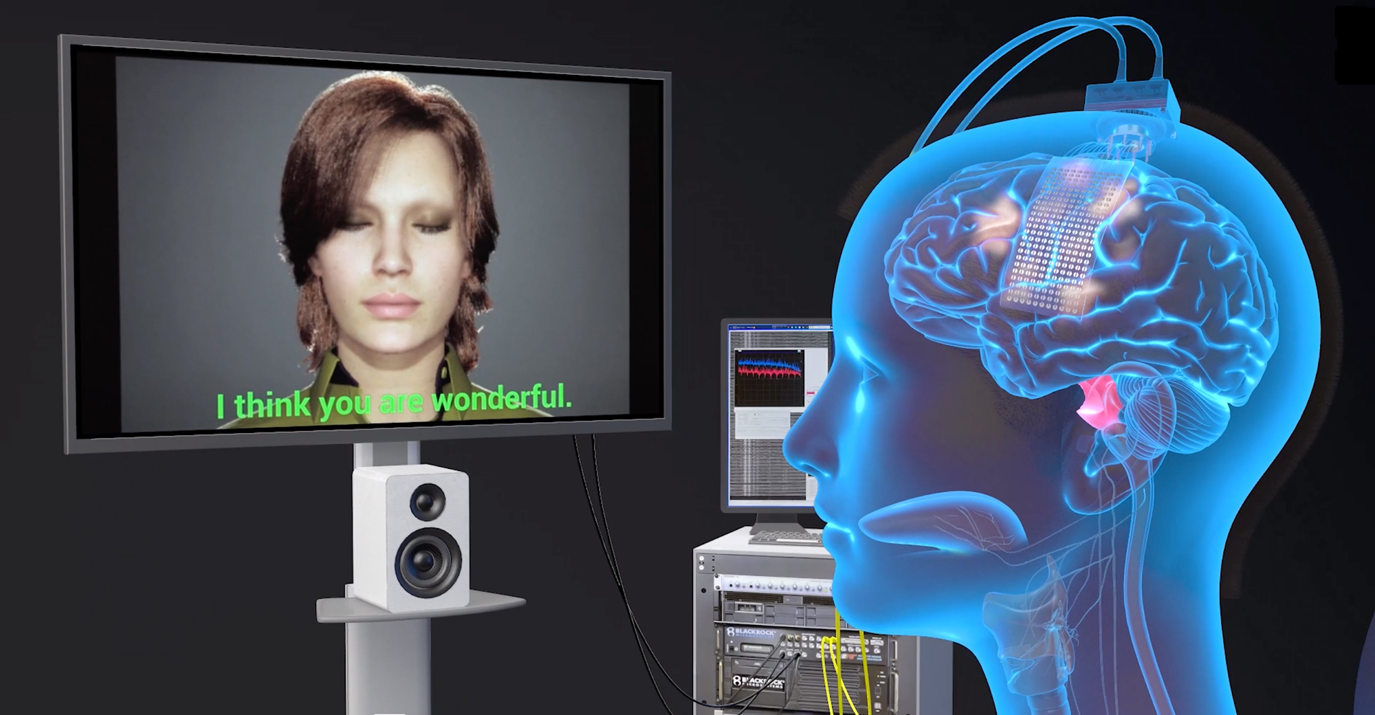 To do this, the team implanted a paper-thin rectangle of 253 electrodes onto the surface of her brain over areas they previously discovered were critical for speech. The electrodes intercepted the brain signals that, if not for the stroke, would have gone to muscles in Ann’s lips, tongue, jaw and larynx, as well as her face. A cable, plugged into a port fixed to Ann’s head, connected the electrodes to a bank of computers.