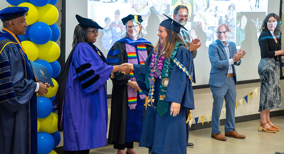 UC Davis Chancellor Gary S. May, Vice Chancellor for Diversity, Equity and Inclusion Renetta Garrison Tull and Dean of the Division of Continuing and Professional Education Julie Greenwood took part in the ceremony. Director of Access Programs at Continuing and Professional Education Jake Hosier, Distinguished Professor Emeritus of Psychiatry and Behavioral Sciences and former MIND Institute director Leonard Abbeduto and Redwood SEED Employment Director Maddi Hinchey also shook hands with the scholars as they walked to receive their credentials.